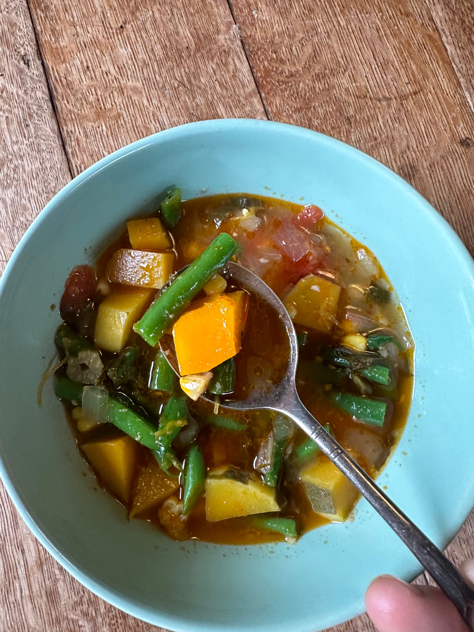 Squash, corn and beans are known as the three sisters - they love to grow together, and Indigenous people throughout North America grew different variations. Here we have sweet corn, delicate squash, green beans. Earthy, filling and delicious, this soup would love a dollop of sour cream and/or a sprinkle of cilantro on top.